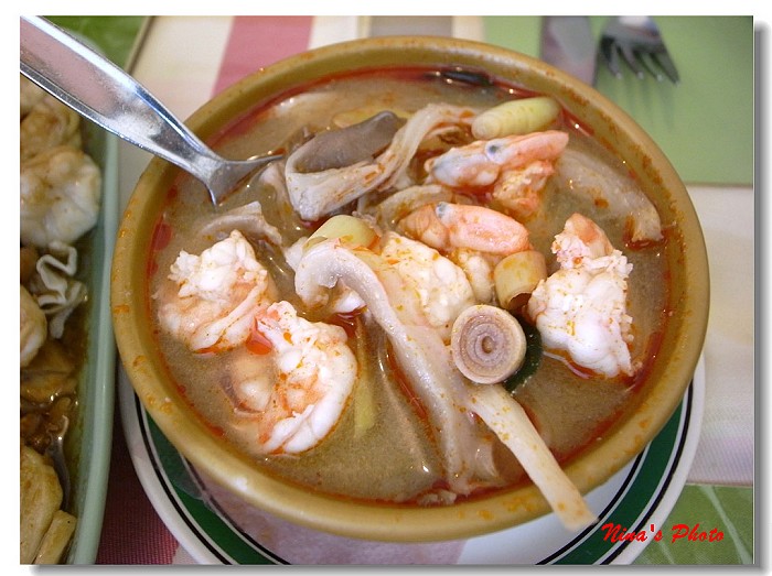 ★來到泰國讓Nina愛上了泰式酸辣蝦湯(Tom Yum Goong),出發前在台灣的瓦城曾嚐過一回,但當時沒有特別感受,只覺得又酸又辣,這次來到普吉,說什麼也要試試這道泰國代表料理。湯頭要熬得好喝真是一門學問,尤重泰國香料,主食材通常是蝦、雞肉或綜合海鮮,再加入蘑菇或秀珍菇,就等一碗口感豐富的湯品上桌啦!說真的,道地的湯真是好喝極了