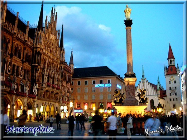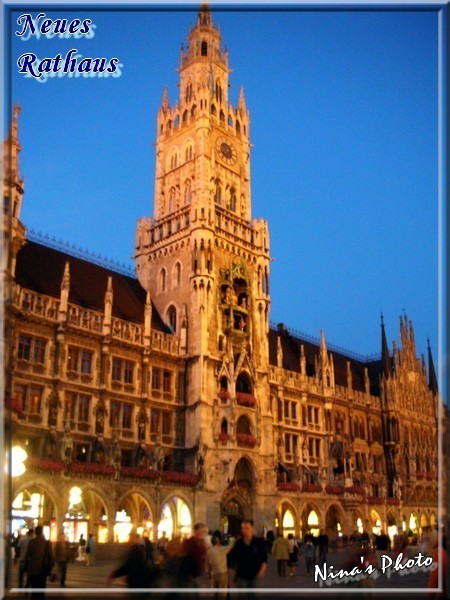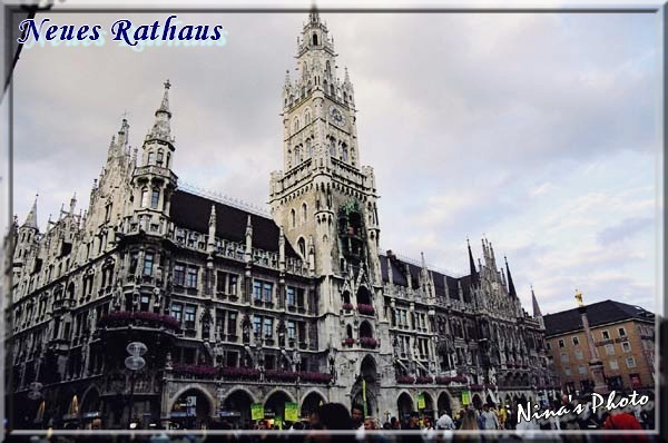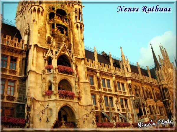 嗯~~雨終於停了,瑪麗恩廣場上愈來愈多人聚集,一旁更搭著表演舞台,好像是為同性戀者所辦的活動,不過表演時間還沒到,反倒是市政廳鐘塔的整點表演又來了,希望比前一晚的精彩。此刻人潮明顯湧入,隨著鐘聲響起騷動更甚,大家都準備好了攝影機,等著打鐘後的演出。果然白天的比夜晚的豐富許多,表演時間也比前晚那場來得長,終於完整地看到書中介紹的歷史劇情,內容是描述著1558年候爵威廉五世和雷娜達的婚禮、騎士的馬上決鬥比賽、製桶工匠的舞蹈等,而前晚只看到夜警及和平天使的簡短演出,果然白天的表演比較有看頭。